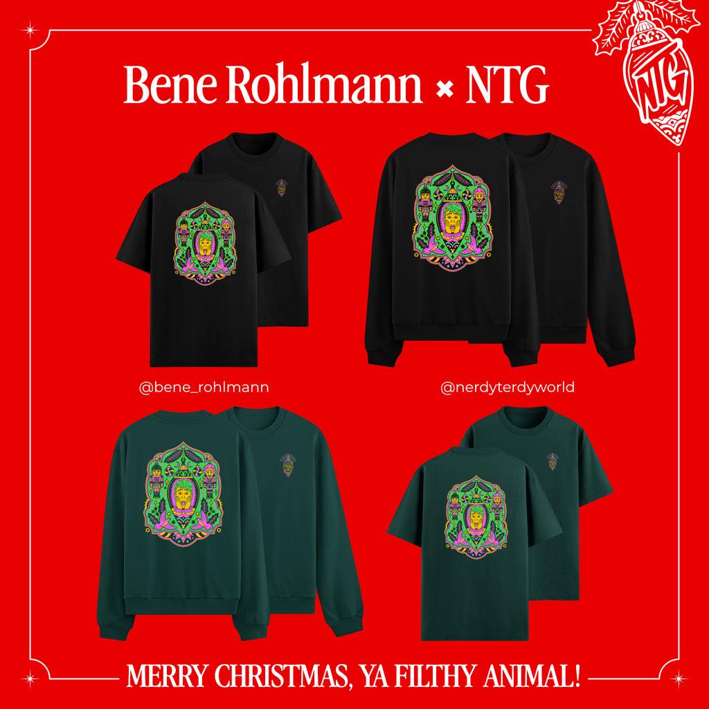 "Guten Tag, hier ist Peter McTerdygang. Ich möchte bitte ein Kleidungsstück mit einem extra großen Print, Weihnachtsmotiv von Designikone Bene Rohlmann und einer kleinen Karte, handgeschrieben vom Chef persönlich, für die man einen Umschlag braucht. Auslieferung bitte vor Weihnachten. Kreditkarte? Kein Problem."